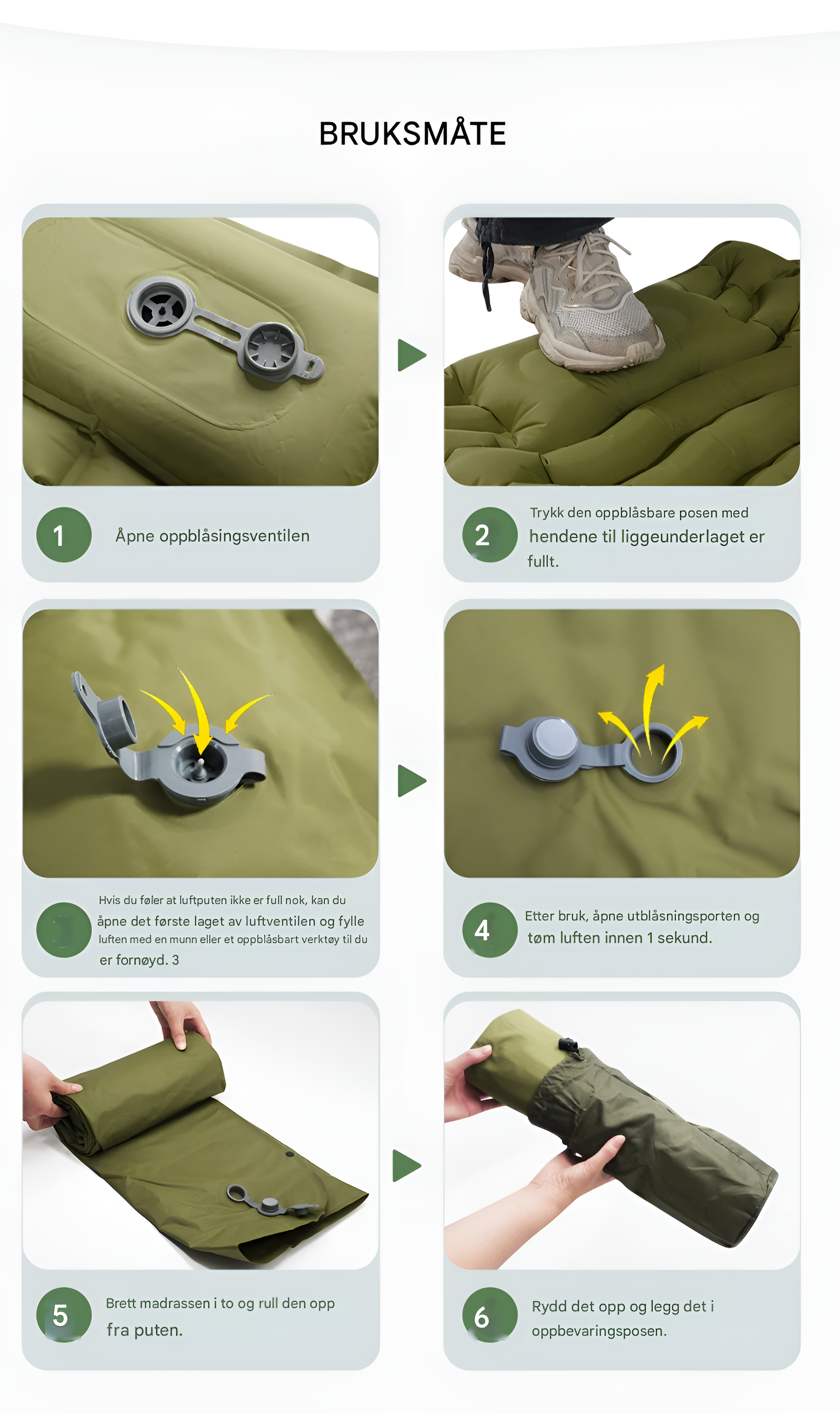 Jeg bruker denne madrassen på fjellturer og camping. Den er robust og komfortabel, og oppblåsingen går raskt.