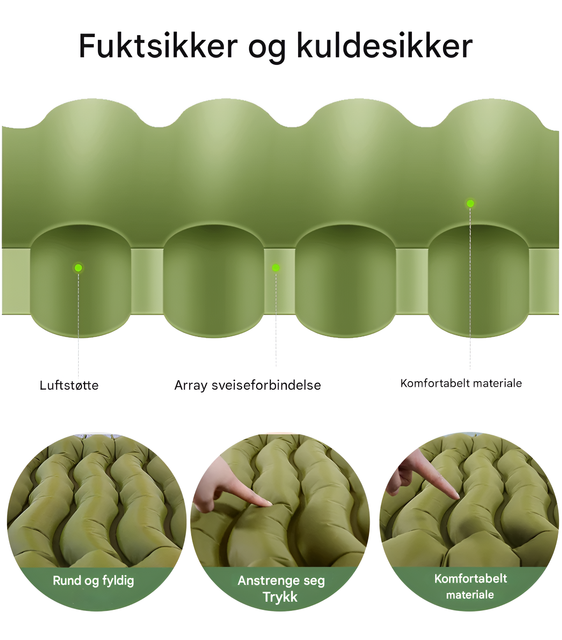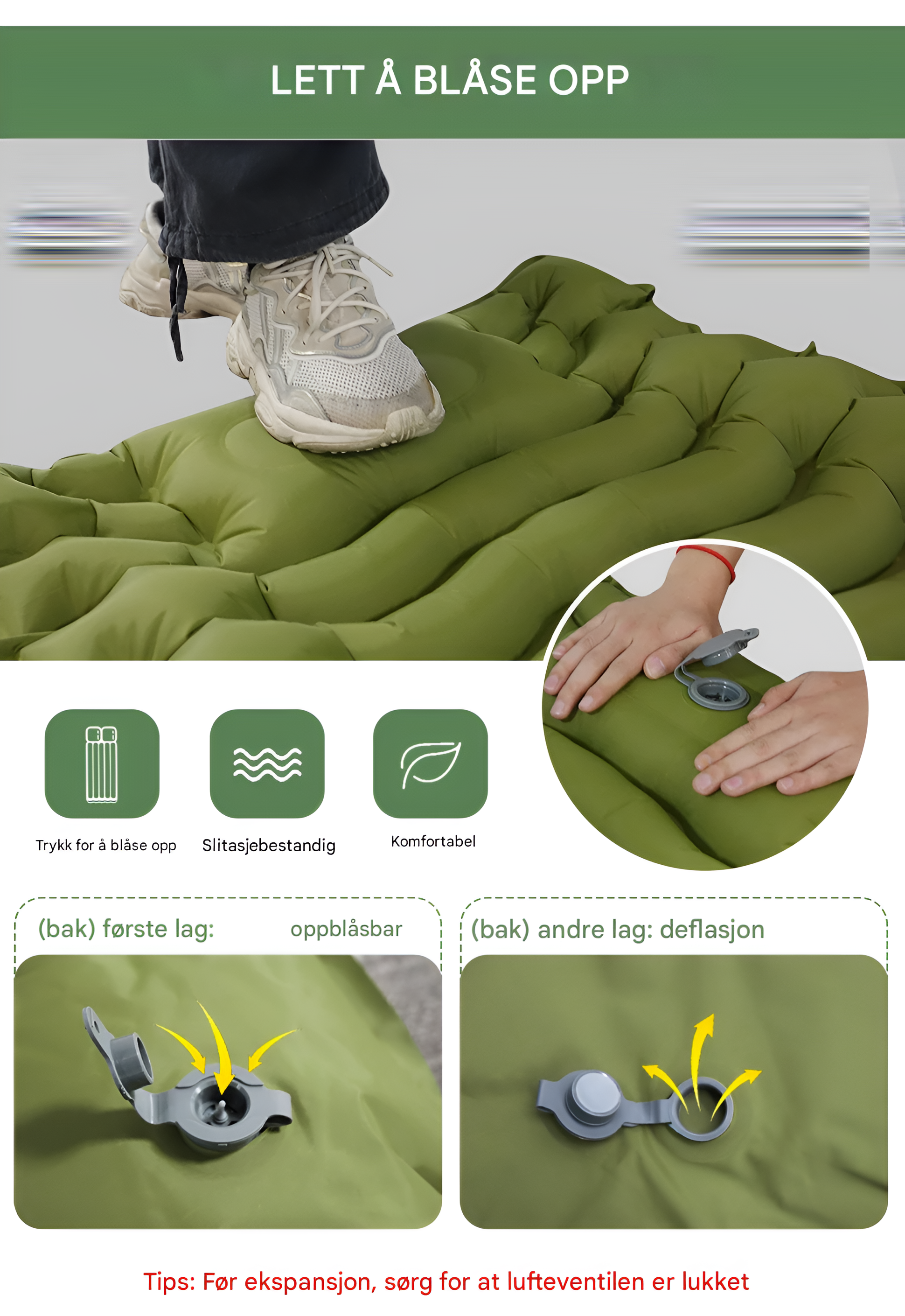 Med den innebygde pumpen er madrassen klar på bare 30 sekunder. Slipp store pumper eller å blåse med munnen. Bare sett foten på pumpen, trykk, og slapp av med en gang.