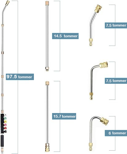 Lansen kan forlenges opptil 90 tommer (ca. 2,3 m) eller 20 fot (ca. 6 m) med de medfølgende forlengelsene. Perfekt for høytliggende områder som tak eller takrenner.