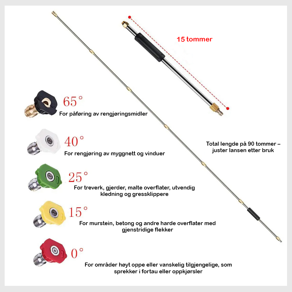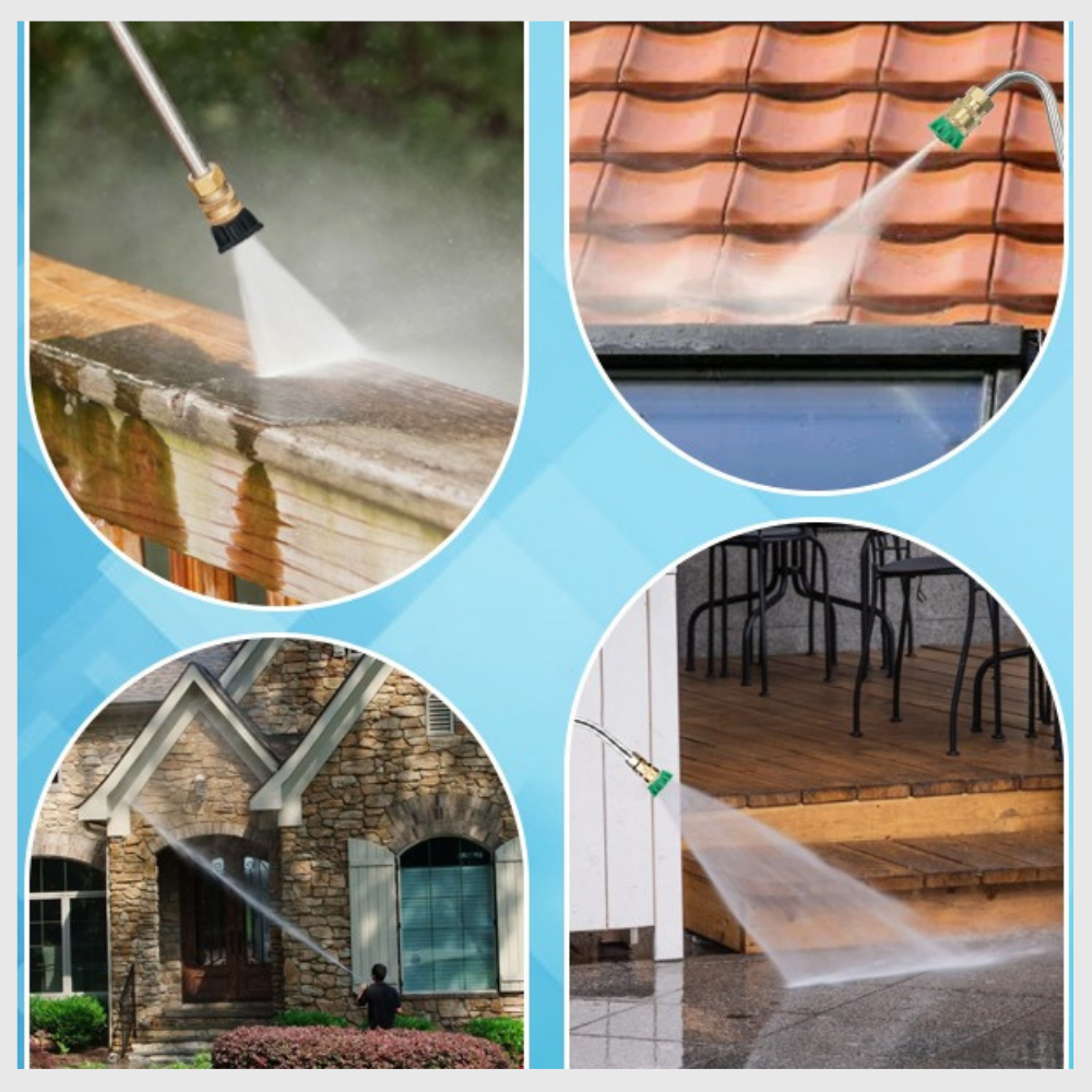 Du kan rengjøre vegger, takrenner, tak, gjerder, vinduer, betong, treverk, biler osv. Hver dyse er utformet for et spesifikt bruk avhengig av vinkel og trykk.