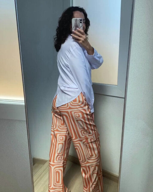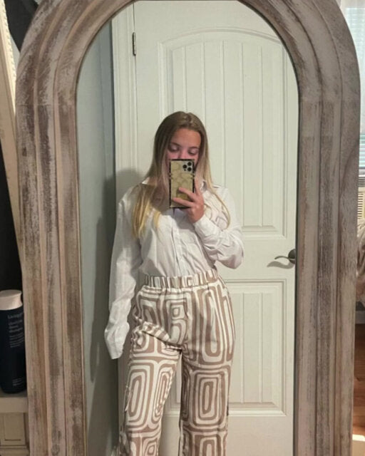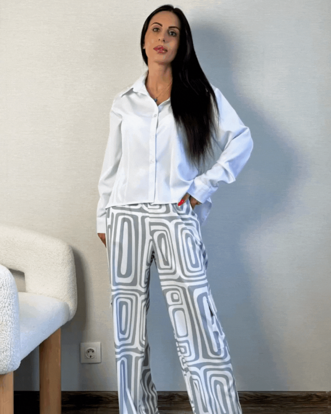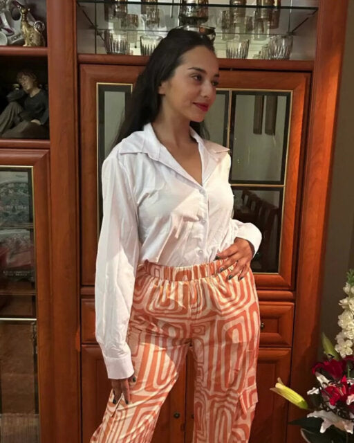 Kombiner stil og komfort med dette uunnværlige settet. Den tidløse hvite blusen og de mønstrede buksene gir deg en sofistikert, men avslappet look. Allsidig og elegant, passer det til alle anledninger – fra kontoret til en kveld med venner. Det matcher alle stiler og former en harmonisk helhet.