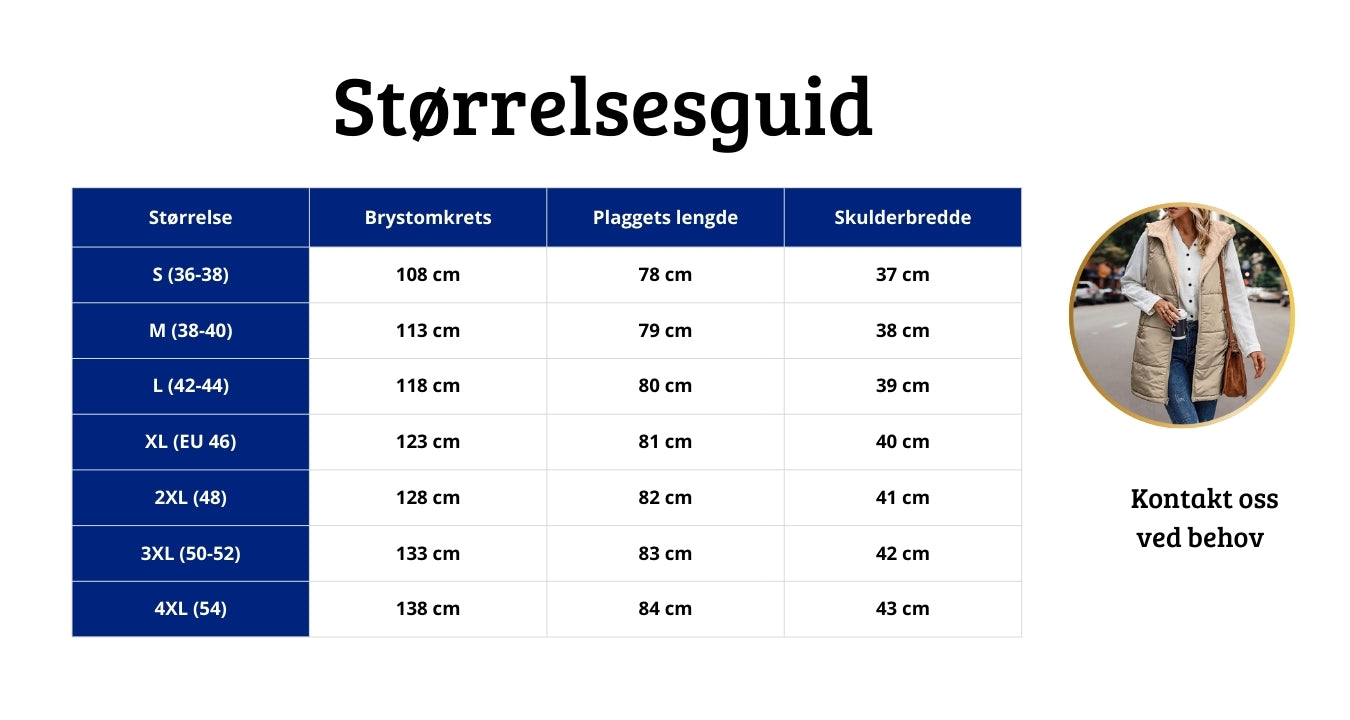 Vi anbefaler å se på størrelsesguiden vår. Hvis du er mellom to størrelser, velg den større for mer komfort – spesielt hvis du ønsker å bruke vesten over en tykk genser.